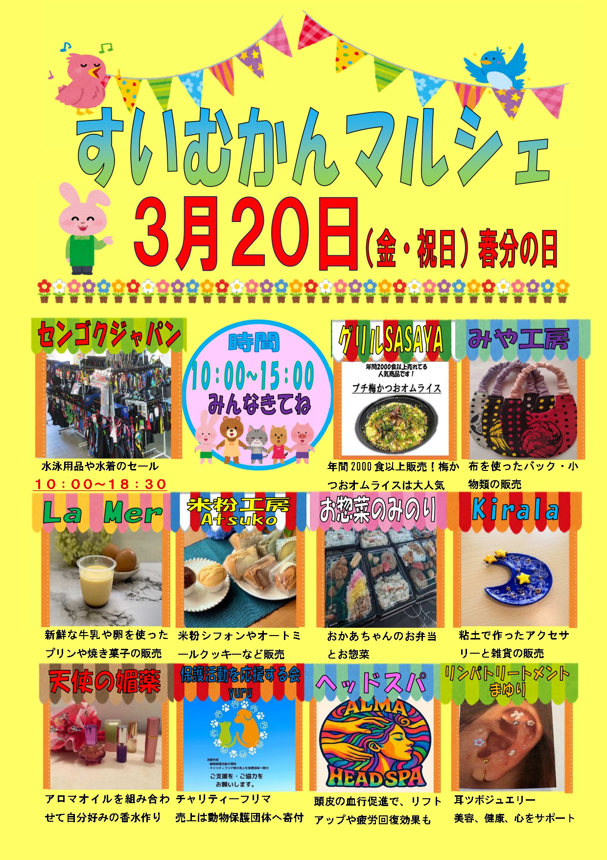 雑貨やお弁当、スイーツ。ヘッドスパ、耳ツボなど